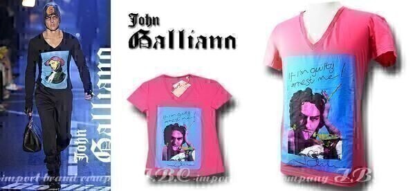 > 名作★galliano ジョンガリアーノ 定番人気のVネックプリントTシャツ しなやか素材で着心地◎ ピンク SizeL【本物保証】入手困難廃盤モデル