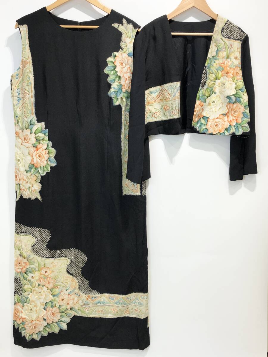 > 【古着】 2点セット アンサンブル 和柄 ノースリーブ ワンピース ノーカラージャケット 和装 和服 絞り 草花 刺繍 着物 リメイク■0930K①