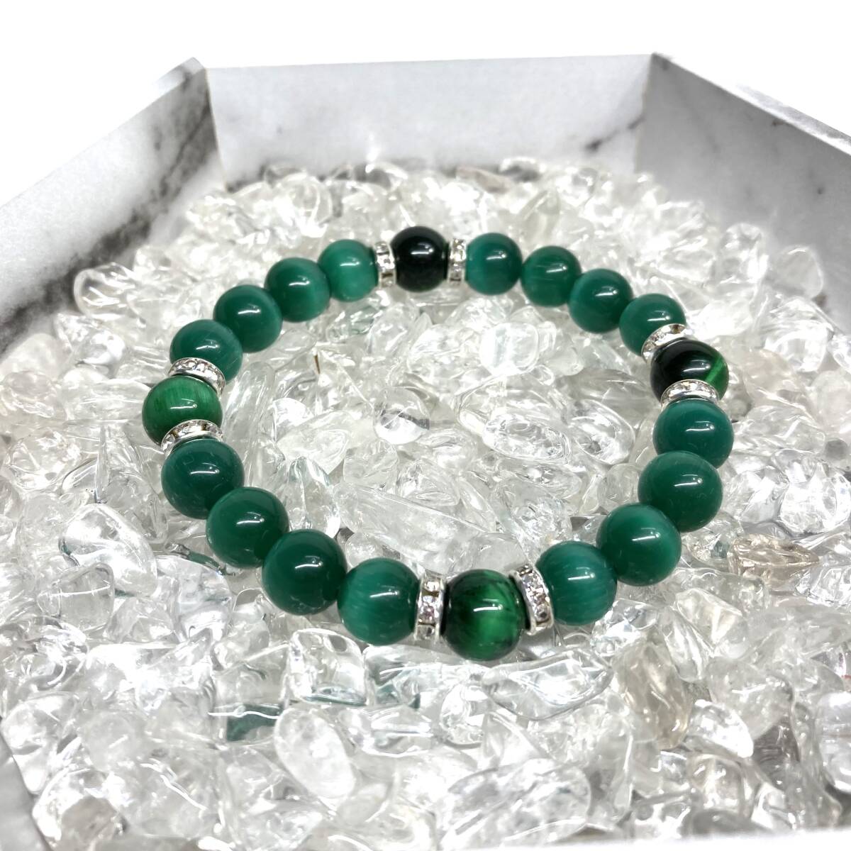 - キャッツアイ(ダークグリーン)×グリーンタイガーアイ パワーストーン ブレスレット (シルバー) 10mm 数珠ブレス メンズ・レディース 男性
