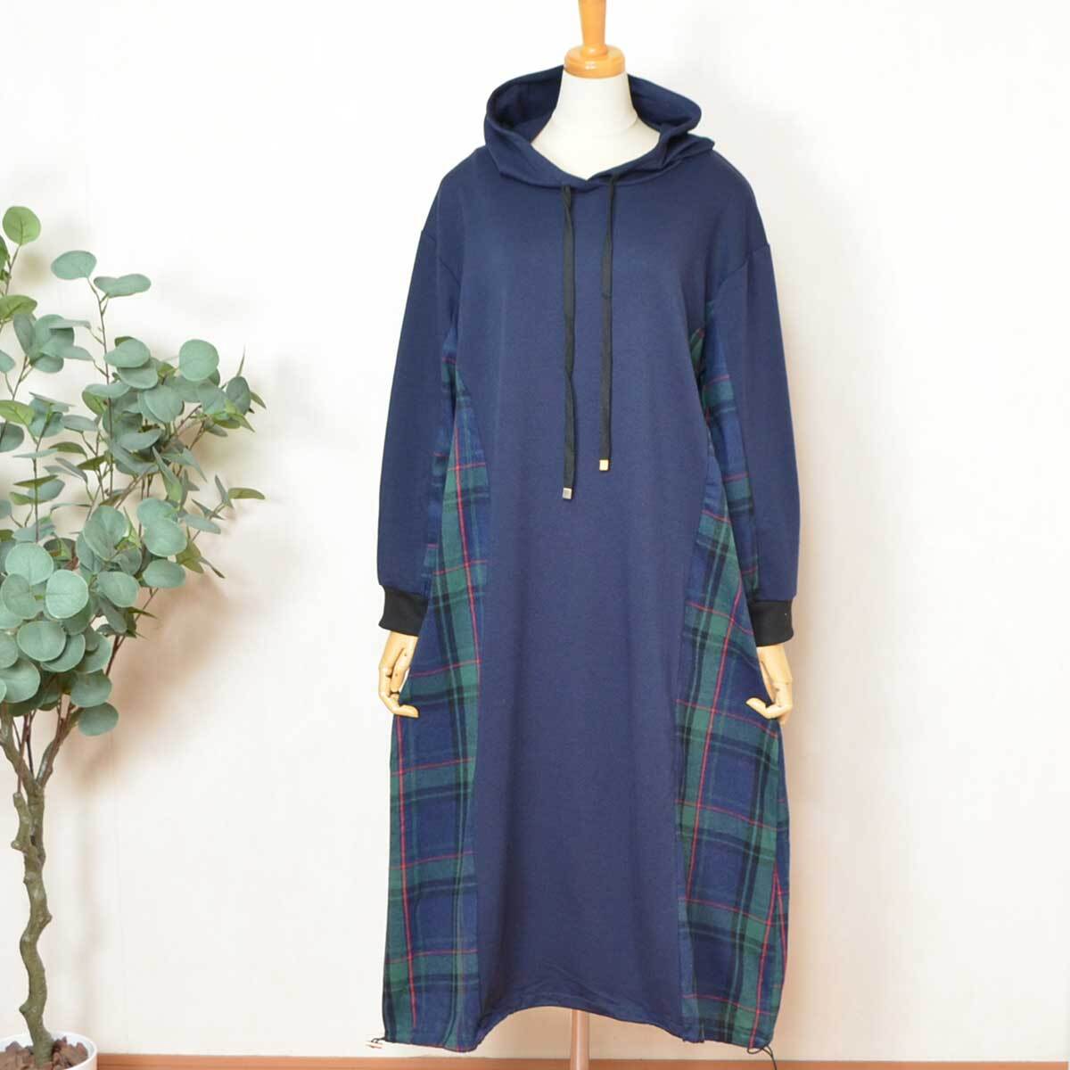 - ワンピース レディース パーカー サイドチェック柄 体型カバー 秋冬 40代 50代 C-3165