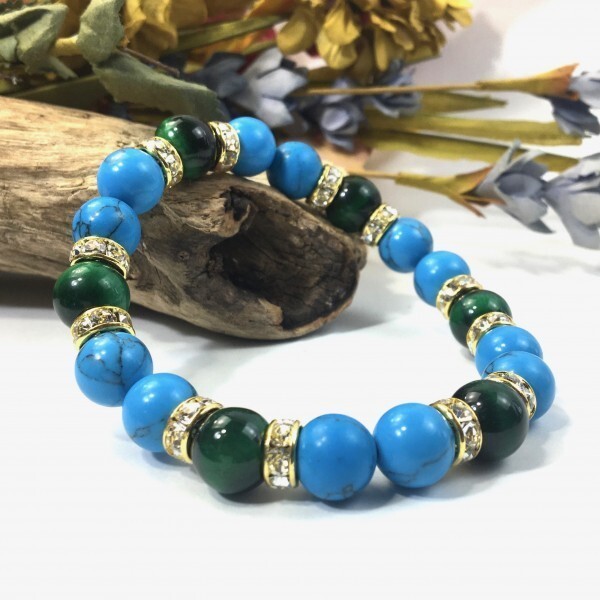 > パワーストーン ターコイズ×グリーンタイガーアイ ブレスレット (ゴールド) 10mm メンズ・レディース 成功 繁栄 安全