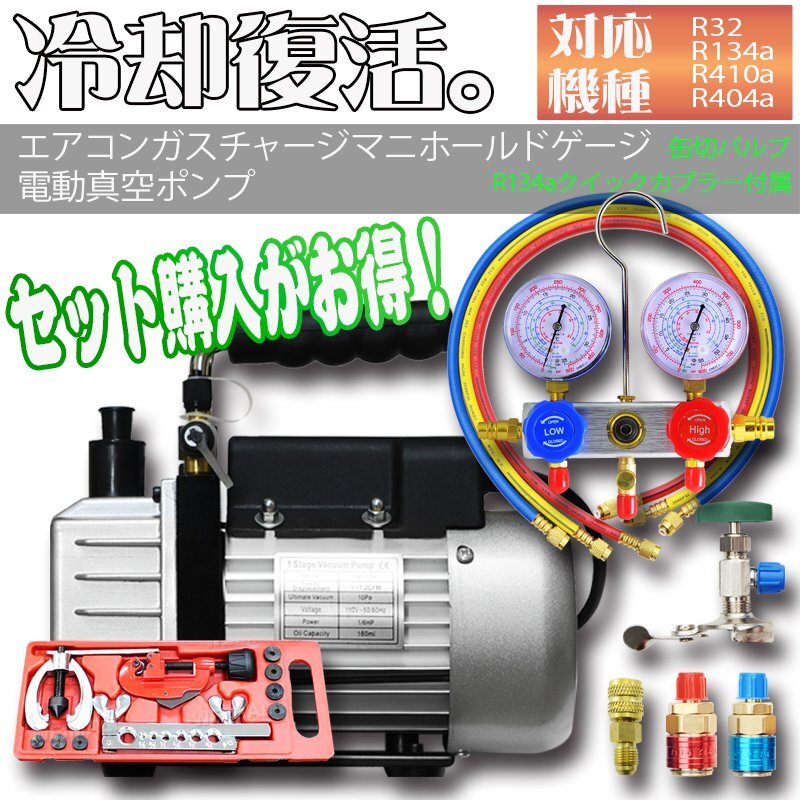 > エアコンガスチャージ 【3点set】真空ポンプ&マニホールドゲージ[R134a R410a R404a R32 対応冷媒]&フレアリングツール