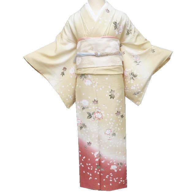 - 訪問着 着物 中古 正絹 袷 フォーマル 金駒刺繍 花の図 桜 紅葉 麦藁色 鉛丹色 多色 身丈163.5cm 裄63.5cm L きもの北條 A1277-13