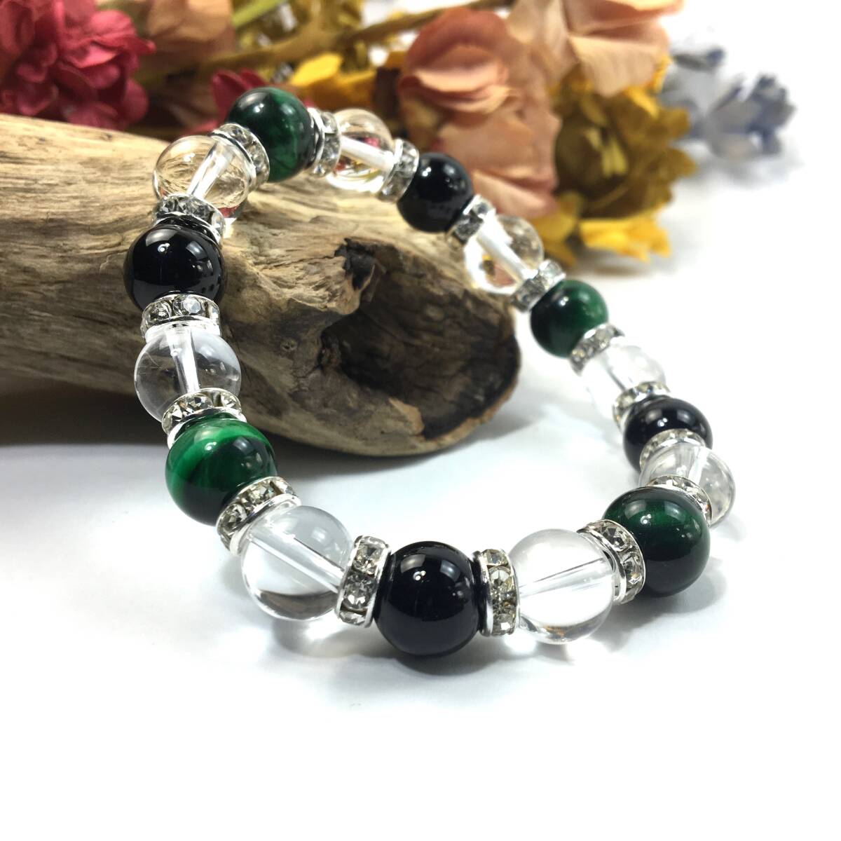 - グリーンタイガーアイ×水晶×オニキス パワーストーン ブレスレット 天然石ブレス (ロンデル: シルバー) 10mm メンズ・レディース
