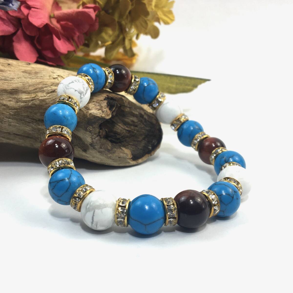 > レッドタイガーアイ×ハウライト×ターコイズ パワーストーン ブレスレット (ロンデル: ゴールド) 10mm メンズ・レディース
