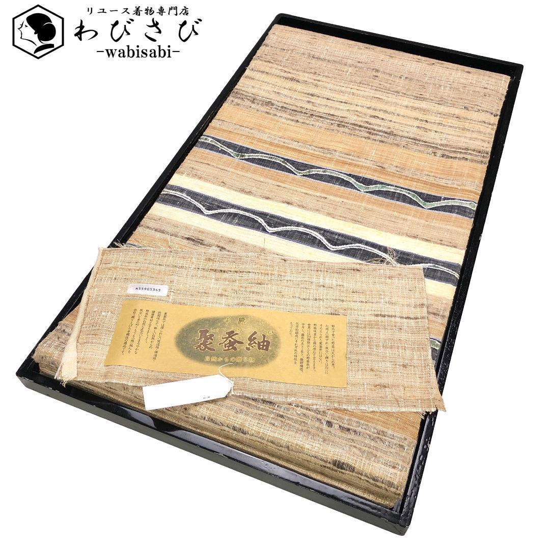 - 袋帯 西陣 聚楽 聚蚕紬 横縞に曲線模様 麦藁色 O-5499 着物 きもの kimono 和服 和装 中古 リサイクル着物 【送料無料】