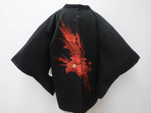 - 《京都一輝堂》【着物】黒羽織 絵羽柄 縫い紋 金糸 華文 しつけ付 羽織り紐別売り 身丈約79cm 裄丈約66.5cm 25z03-1146