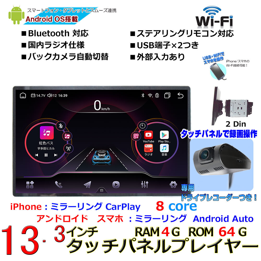 > 大画面2DIN13.3インチタッチパネルフルハイビジョンAndroid13 RAM4G ROM64G iPhone Carplay android auto+専用ドライブレコーダー