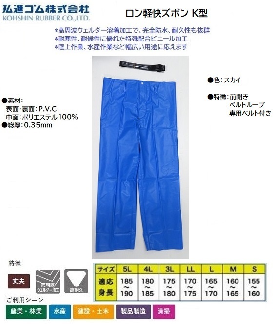 - 【現品限り特価】弘進ゴム 合羽 ロン軽快ズボン K型【スカイ・LLサイズ】完全防水・耐久性・耐寒性の品が、即決1980円★
