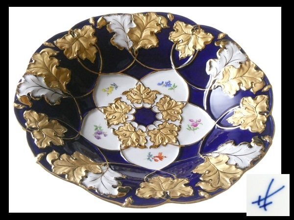 > マイセン Meissen 高級シリーズ グランツゴールド 木の葉レリーフ コバルト 小花絵 プレート 大皿 飾皿 29cm n323