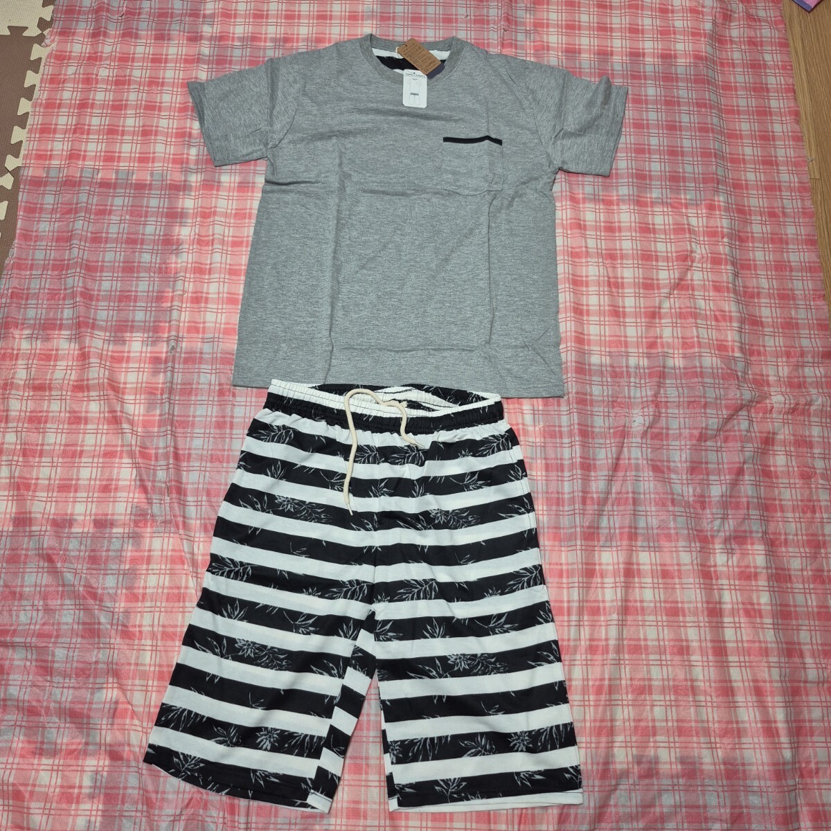 > グレー Lサイズ L トップス Tシャツ ストライプ ショートパンツ 上下セット シャツ ハーフパンツ ショート パンツ メンズ 上下 セット