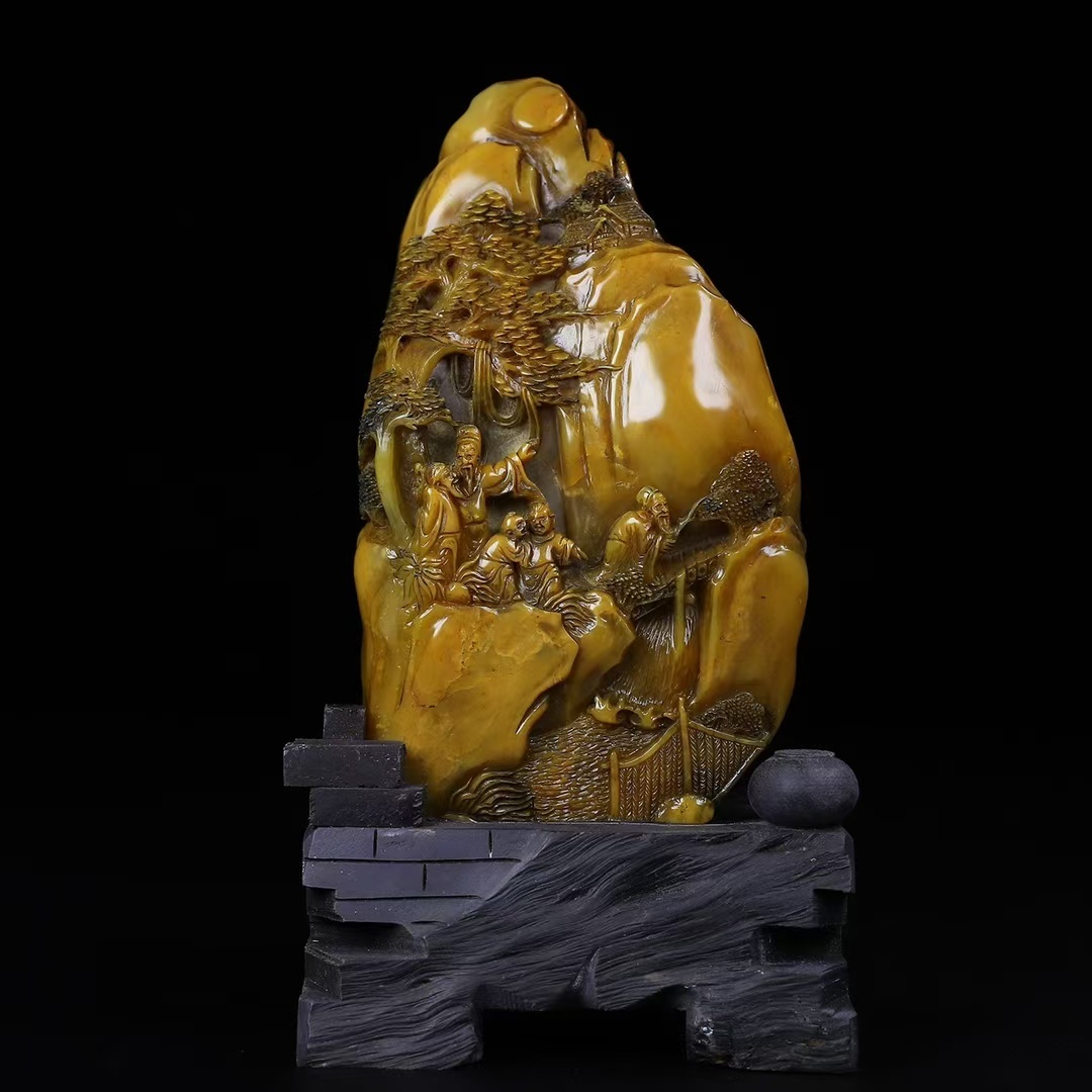 - 玉石 寿山石原石彫 山水人物紋 深山訪友 文房具 書道品 古擺件 古置物 賞物 手彫 極細工 中国古玩 骨董品 時代物 稀少唐物