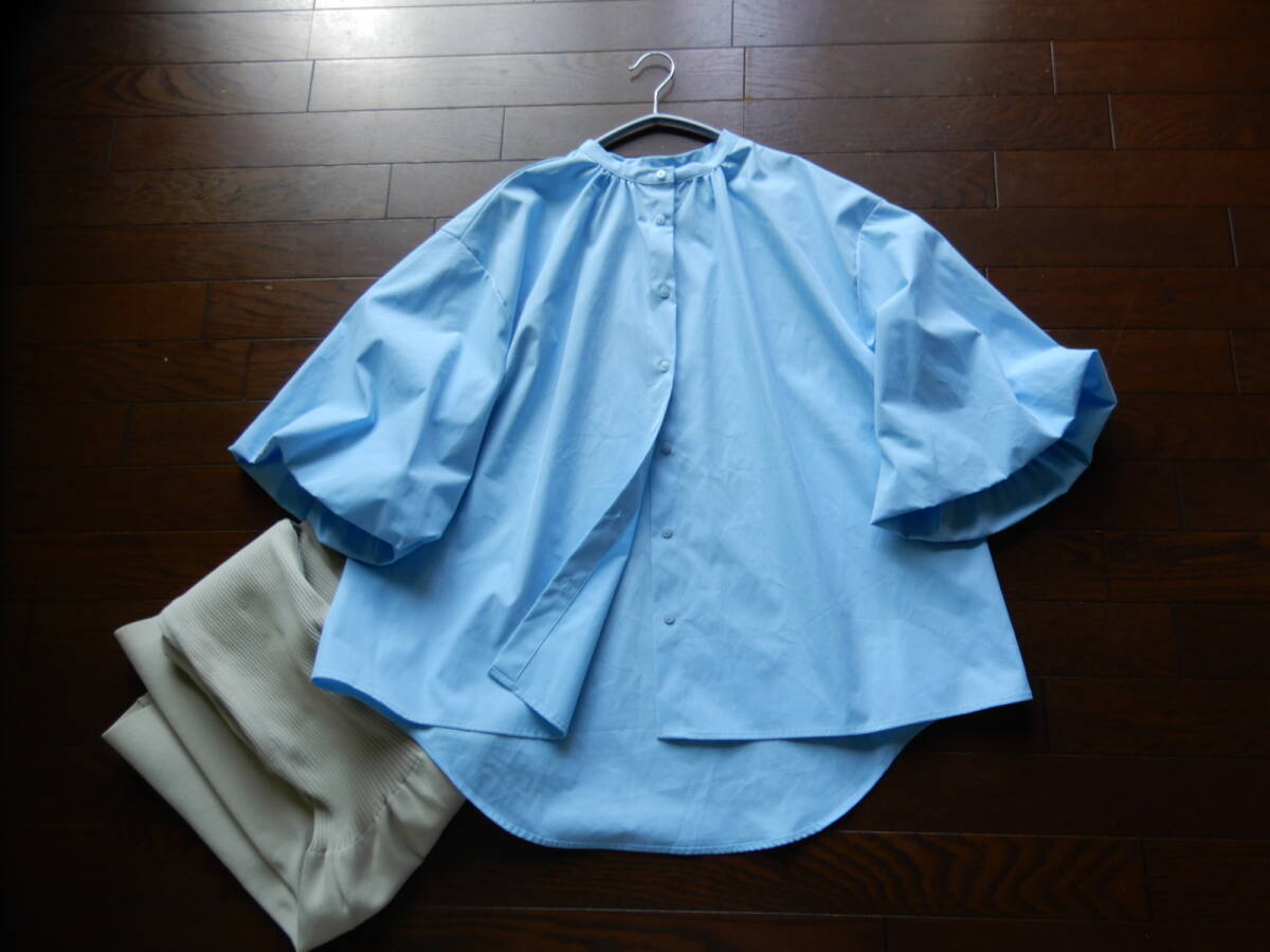 > 【coca/コカ】L ゆったり大人可愛いバルーンボリュームスリーブスタンドカラーブルー系水色オーバーシルエットブラウス