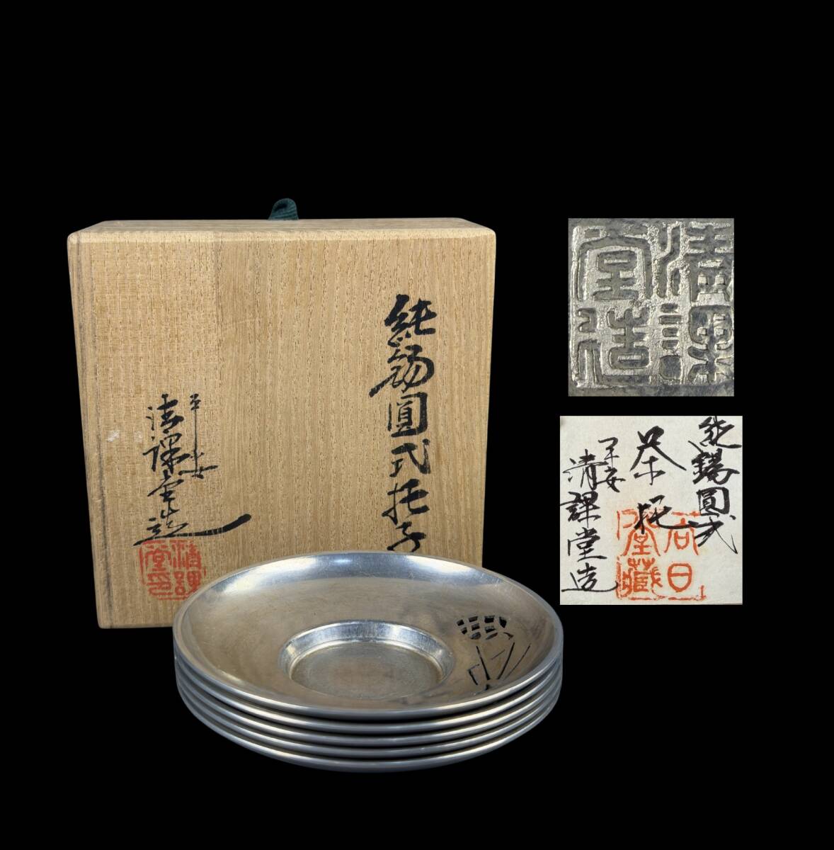 > 【偲】純錫圓式托子 透 平安 清課堂造 錫 茶托 5客 5枚 茶卓 茶 茶道 茶道具 煎茶 煎茶道具 共箱 在銘 重約290g 直径約8.9㌢ g-20