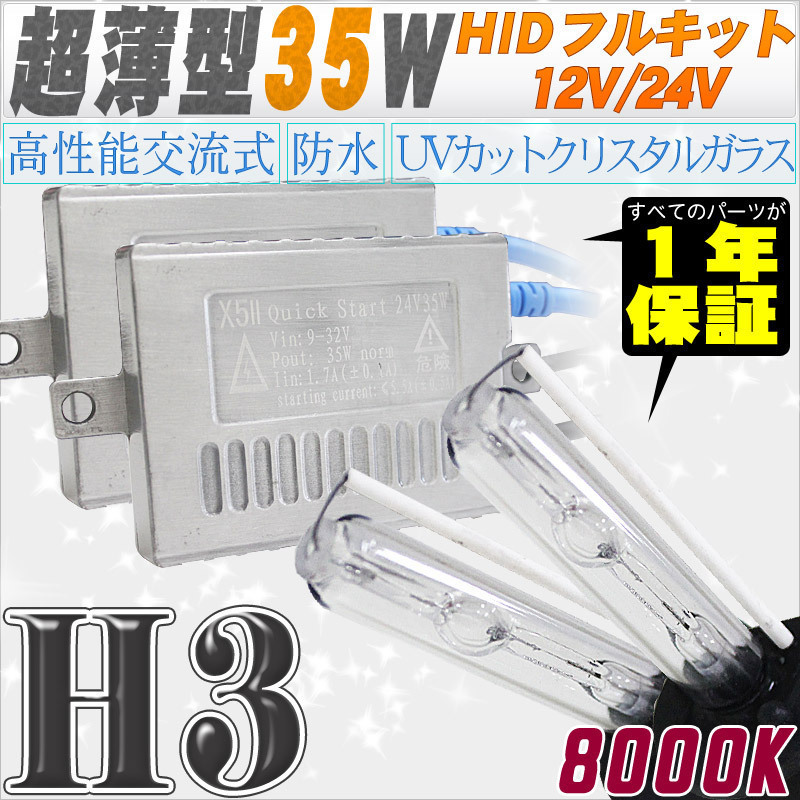 - 高性能 薄型HIDキット 35W H3 8000K 12V/24V 【交流式バラスト&クリスタルガラスバーナー】