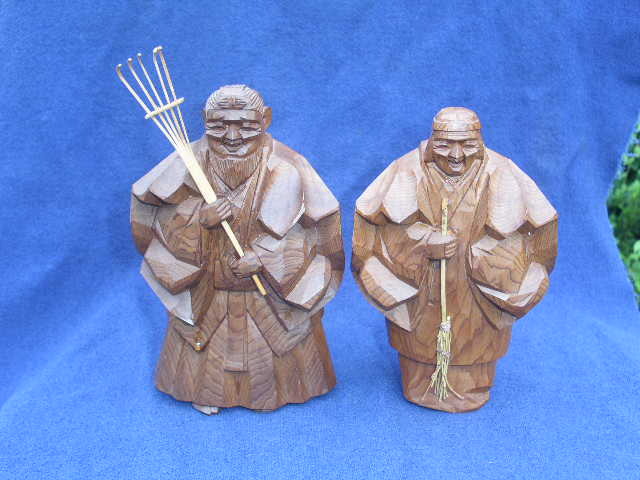 - ★レトロ★ 銘木 一位一刀彫り 高砂 一対 克之作 木彫り 床飾り 縁起物 夫婦円満(ビンテージ・アンティーク・インテリア)