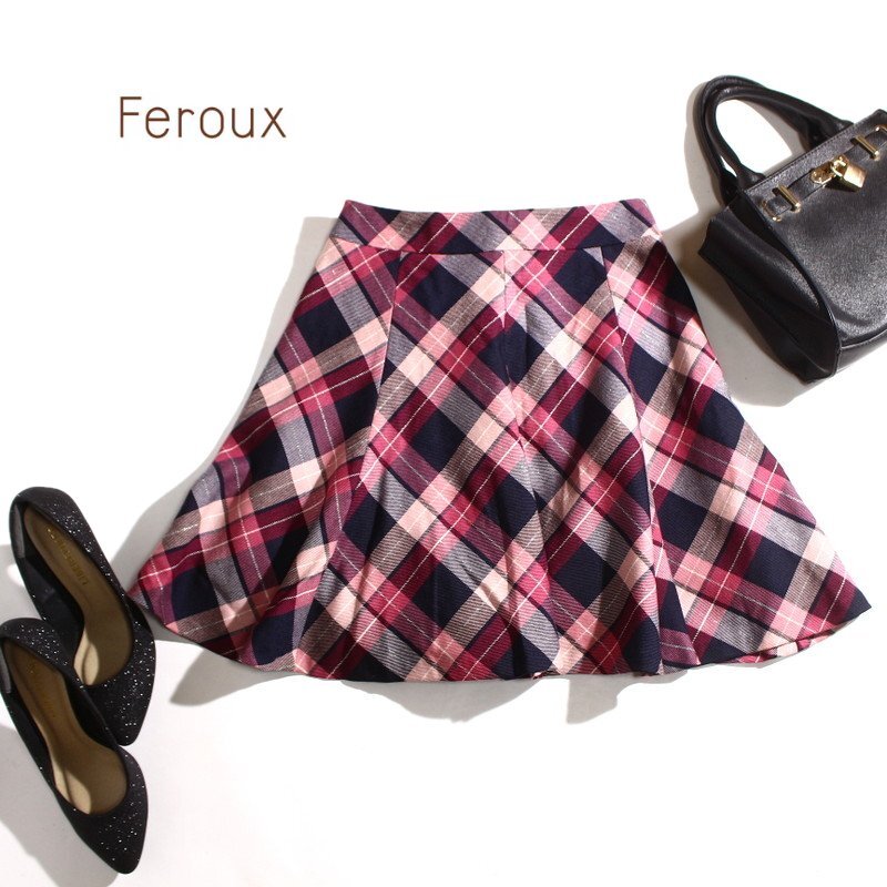 - 美品 Feroux フェルゥ 株) オンワード樫山 秋 冬 可愛い ラメ チェック柄 フレア ウールスカート フレアスカート 1 ネイビー 紺 ピンク