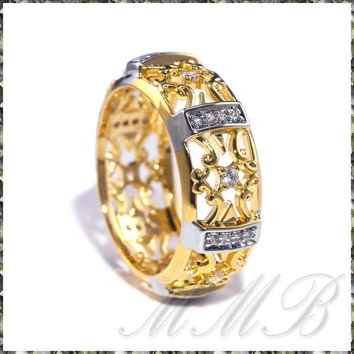 - [RING] Yellow & White Gold Ethnic Strength ハイクオリティ エスニック 彫刻 クリスタルCZ イエロー & ホワイトゴールド リング 14号