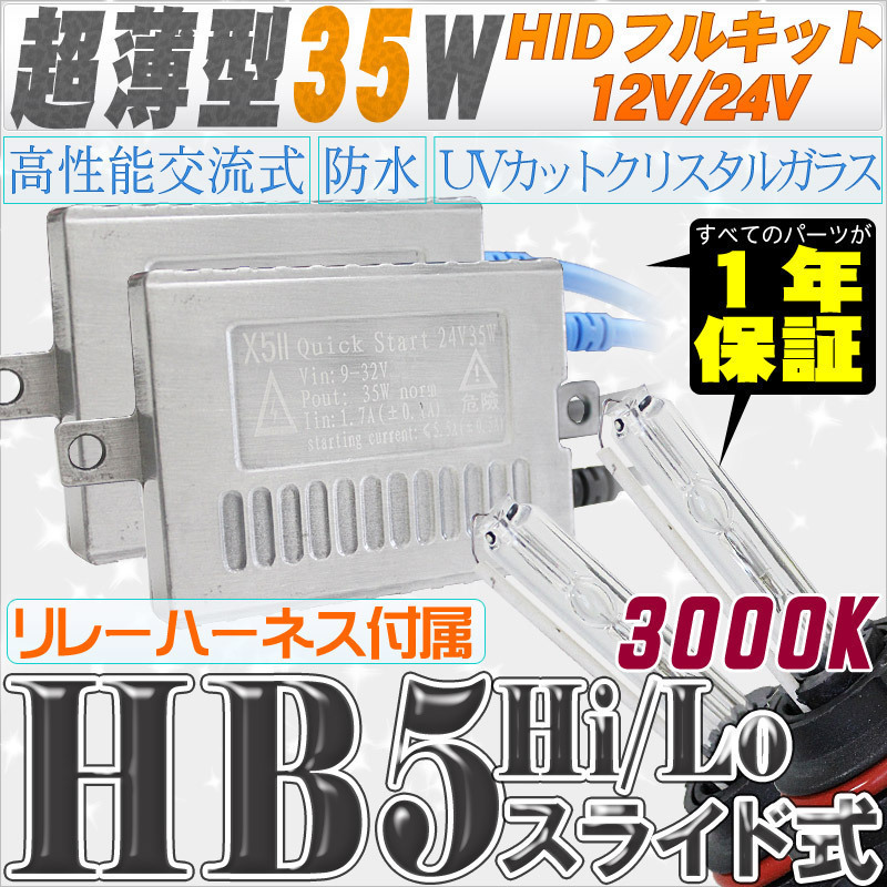 - 高性能 薄型HIDキット 35W HB5 Hi/Lo スライド式 リレー付 3000K 12V/24V 【交流式バラスト&クリスタルガラスバーナー】
