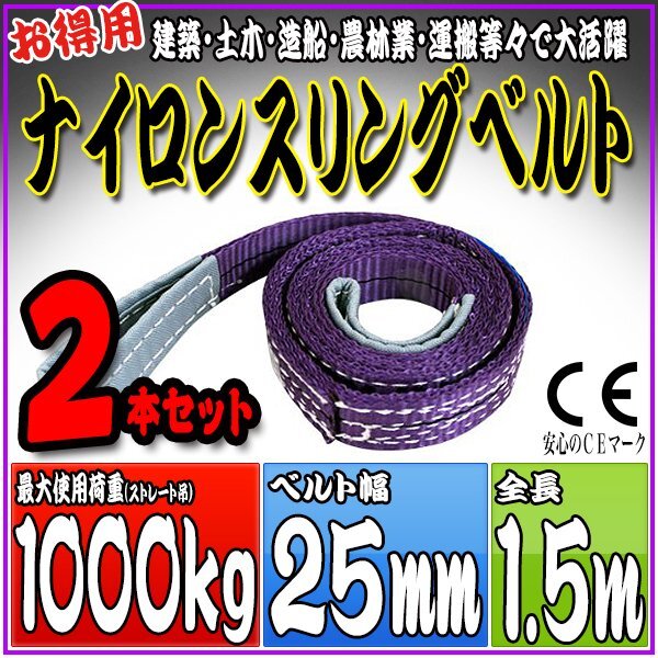 - スリングベルト2本セット 1.5m 幅25mm 使用荷重1000kg 1t 1.0t 吊りベルト ベルトスリング [ナイロンスリング 吊上げ ロープ 牽引 運搬]