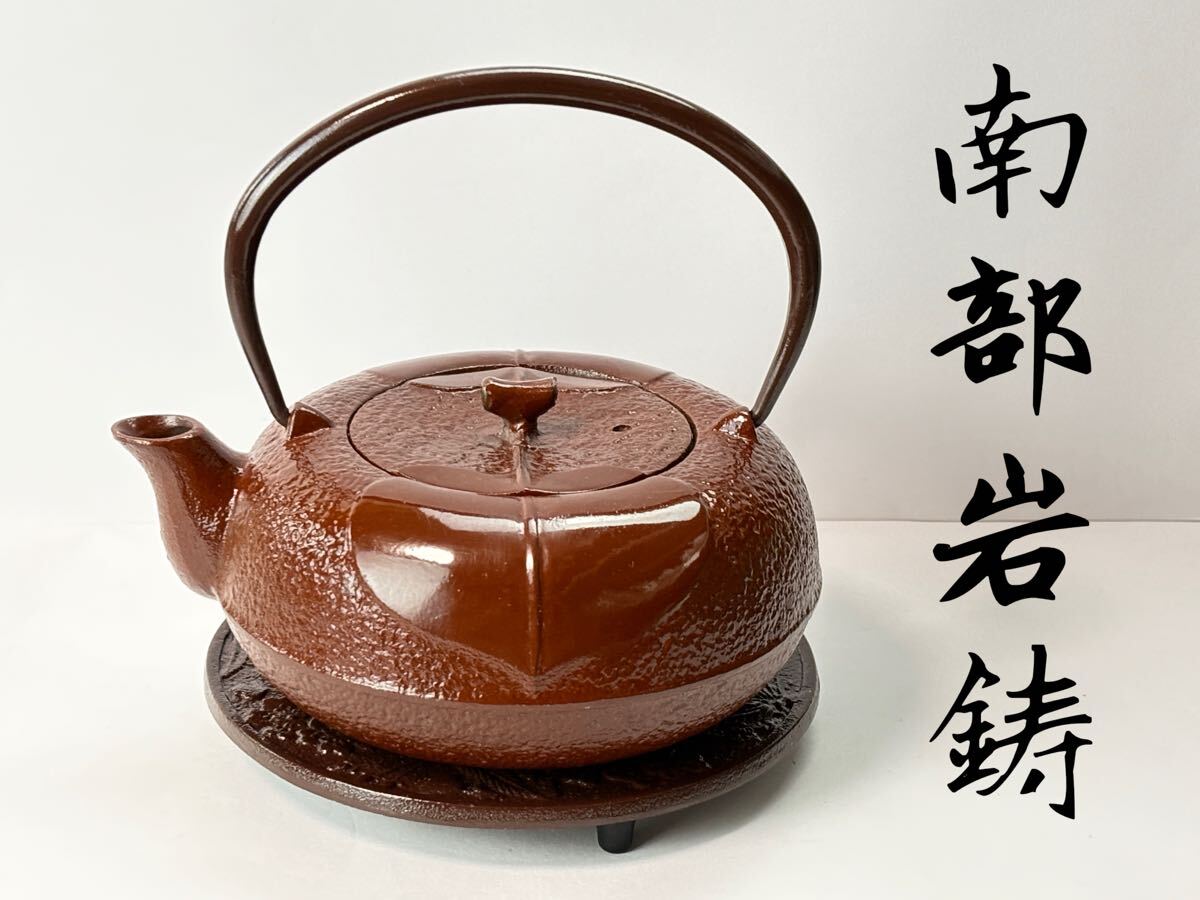- T492 南部鉄器『岩鋳』柿葉紋 鉄瓶 急須 台座付 茶道具