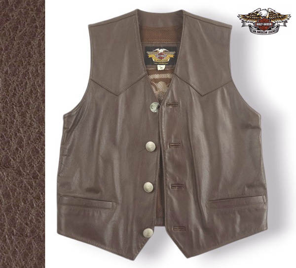 - 美品 HARLEY-DAVIDSON ハーレーダビッドソン 豪華バック刺繍 コンチョボタン 牛革 レザー ライダースベスト 茶 M【参考価格¥48,400-】