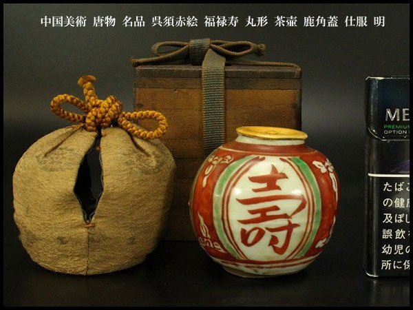 > 【銀閣】中国美術 唐物 名品 呉須赤絵 福禄寿 丸形 茶壷 鹿角蓋 仕服 明 旧家蔵出 送料無料(MG780)