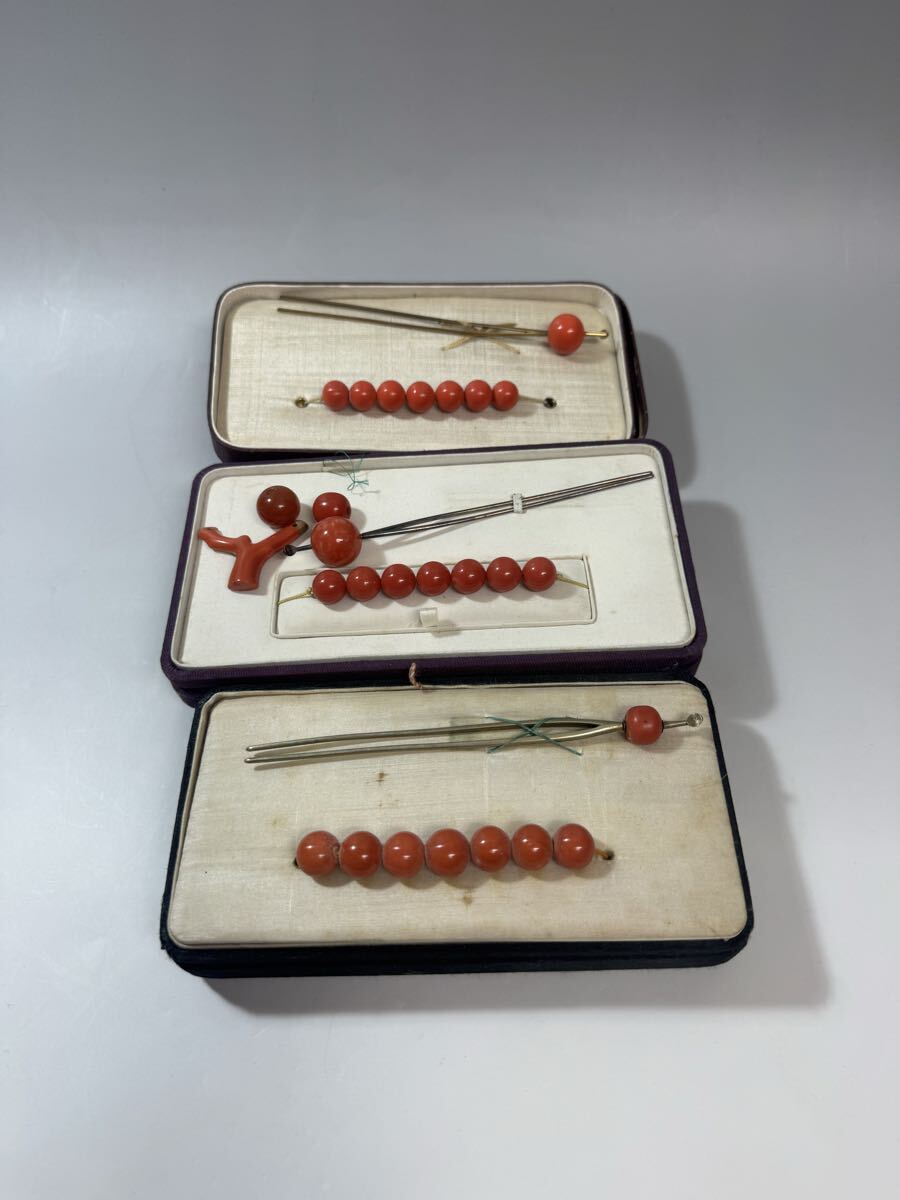 - アンティーク 珊瑚 珊瑚風 玉簪 根掛 ケース付属 和装小物 時代物