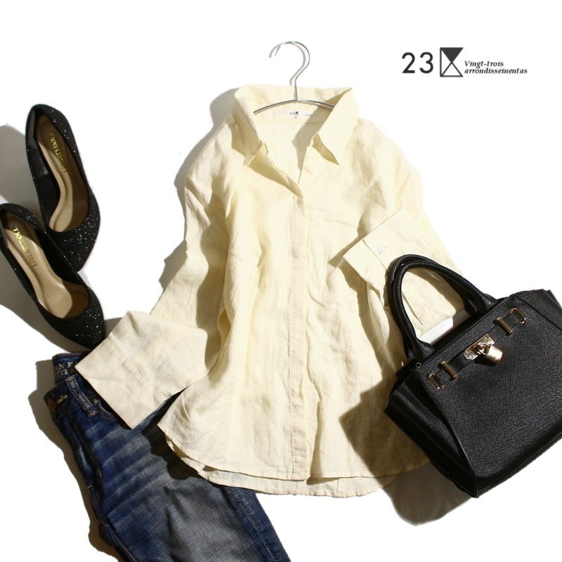 - 美品 23区 株) オンワード樫山 春 夏 オーガンジー 麻100% リネン 七分袖 シャツ 9号 38 ライトベージュ リネンシャツ 羽織り ミセス