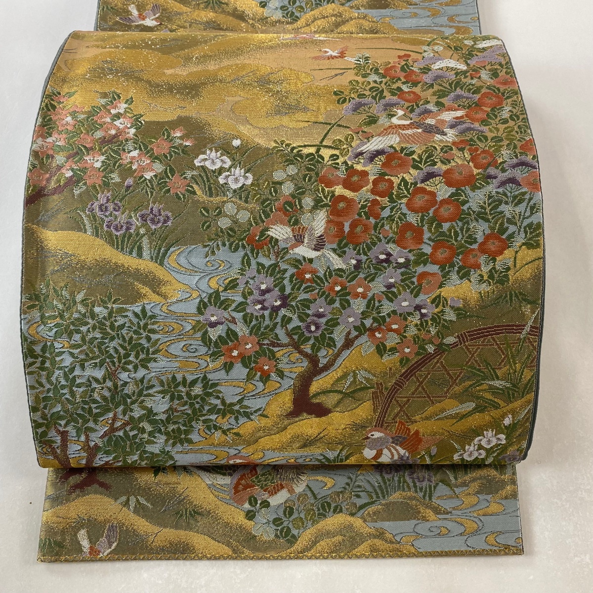 > 袋帯 美品 秀品 椿 鳥 箔 金糸 金色 六通 正絹 【中古】