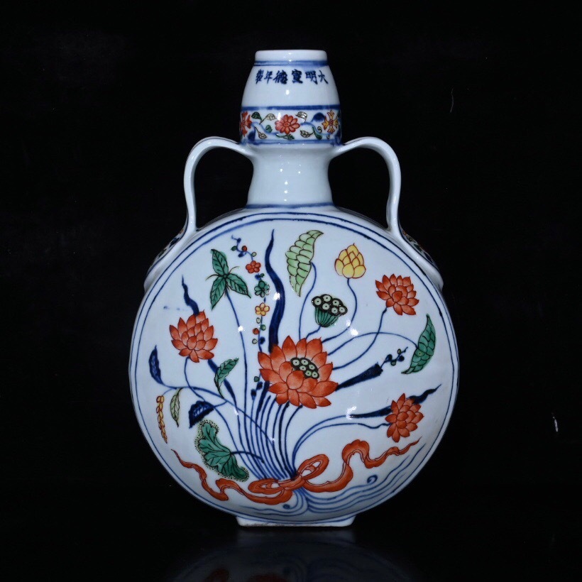 - 蔵友旧蔵出 明 宣德年製款 五彩 一束蓮紋 雙耳扁瓶 稀少珍品 貴重品 古陶瓷品 置物 古賞物 中国古玩 中国古美術品