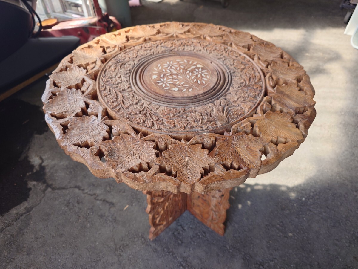 - ● インド製 透かし彫り 木彫り サイドテーブル 花台 飾り台 アジアン家具 コーヒーテーブル インテリア レトロ アンティーク 中古 ③