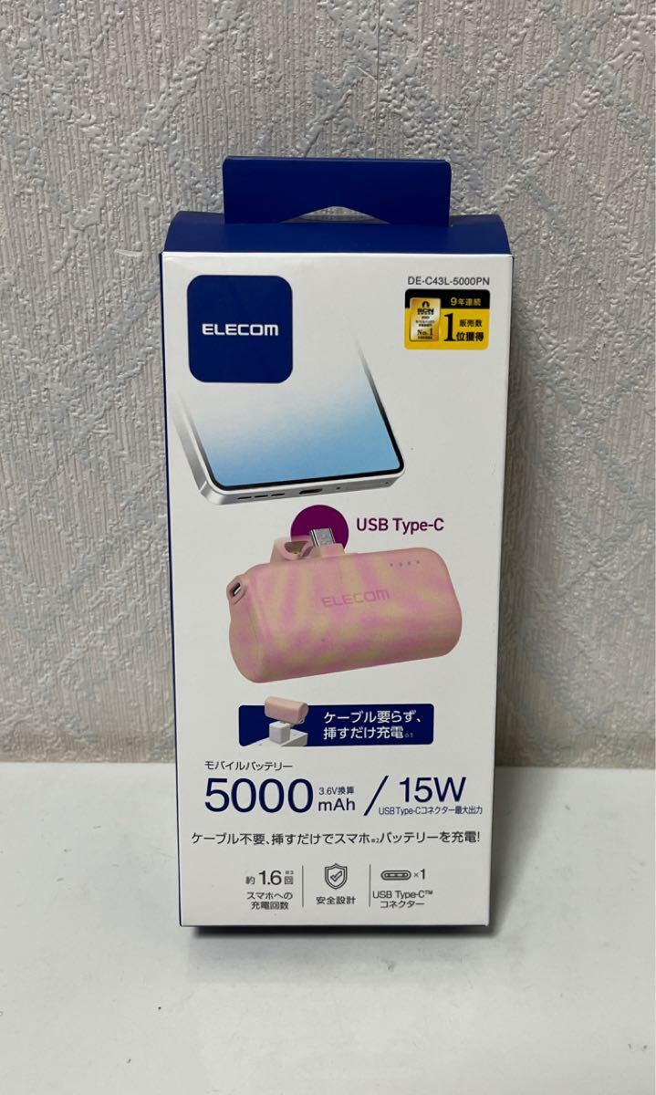 - 710i0514 エレコム モバイルバッテリー 15W 5000mAh Type-C 直挿し 小型 軽量 ケーブル要らず、挿すだけ充電 Type-Cケーブル付属 ピンク