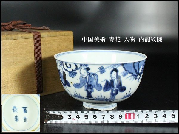 > 【金閣】中国美術 青花 人物 内龍紋碗 φ12.5cm 旧家蔵出 送料無料(FA943)