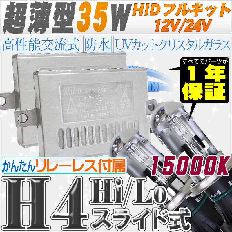 - 高性能 薄型HIDキット 35W H4 Hi/Lo スライド式 リレーレス、キャンセラー付 15000K 12V/24V 【交流式!高級HIDキット】
