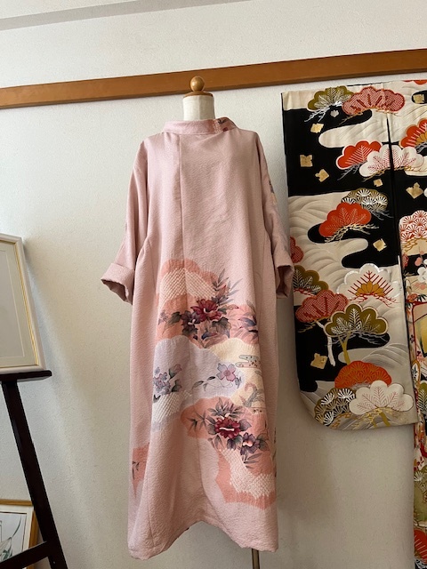 - 5872/未着用訪問着/大人ピンクに絞りと手描きのボタンなどの花の模様で前はサイド、後はW切替の2WAYワンピース♪着物リメイク♪入学式~