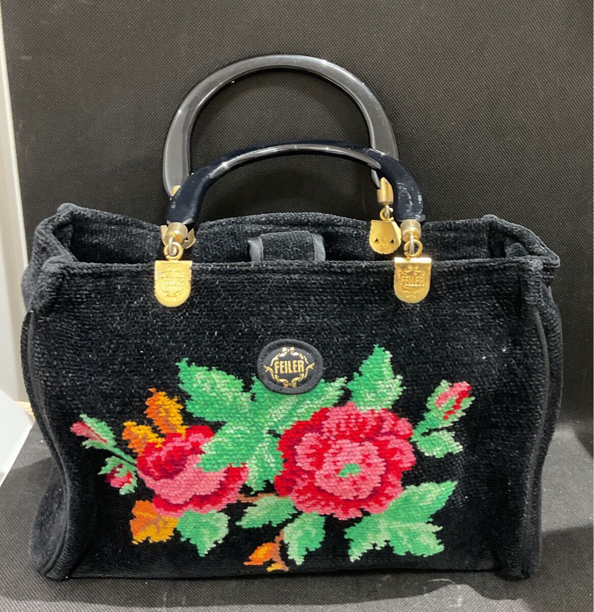 - 【P-3059】FEILER 花柄 黒 ミニトートバッグ プラスチック柄付き マチあり シェニール織 ハンドバッグ
