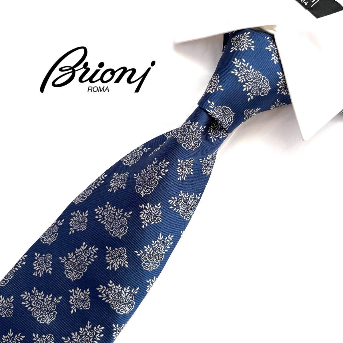 > 美品 Brioni ブリオーニ シルク ネクタイ パターン柄 小紋柄 花柄 ネイビー ビジネス カジュアル フォーマル イタリア製