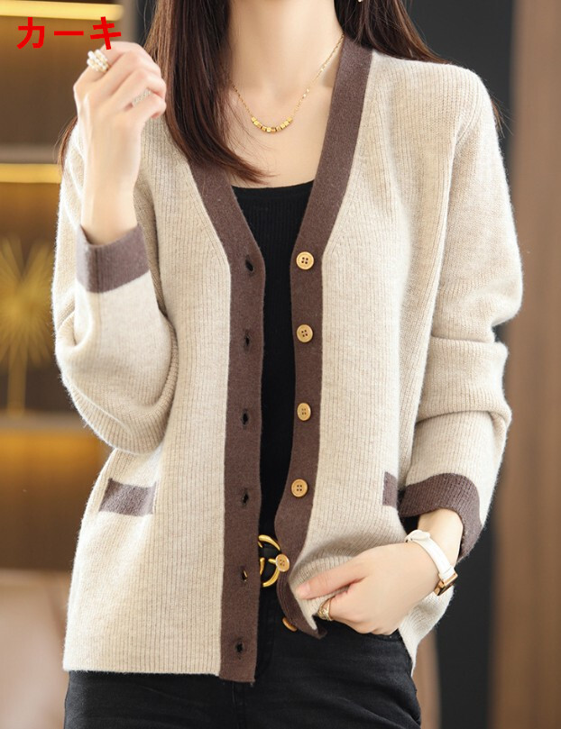 - レディース カーディガン 秋冬 ニットジャケットvネック ニットセーター アウター ショールカーディガ 羽織り カーキ フリーサイズ