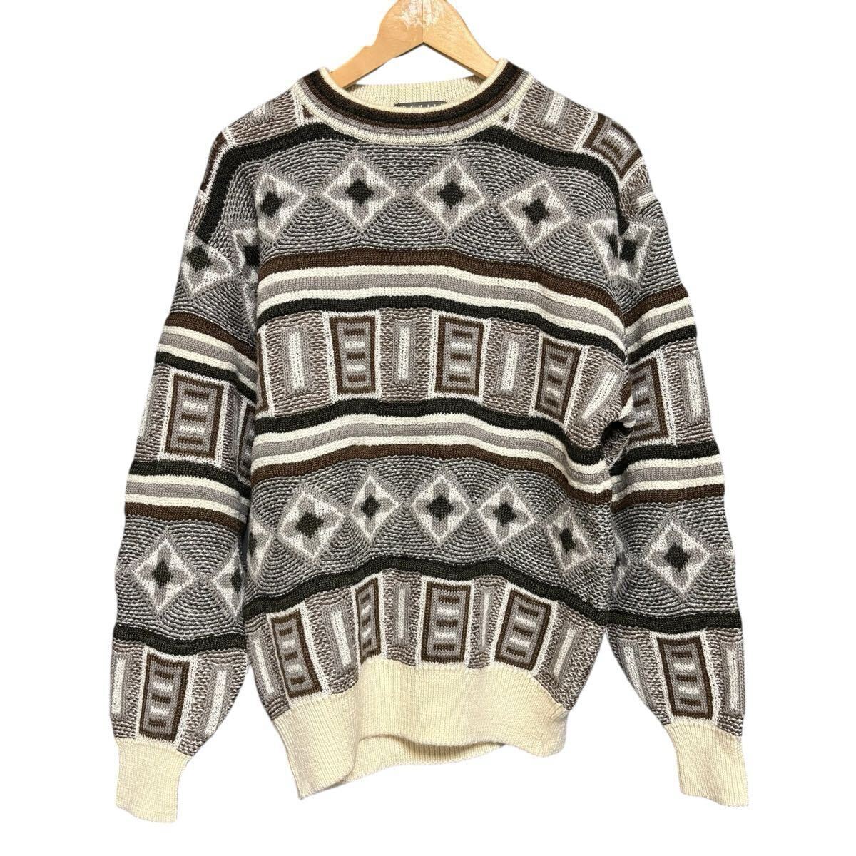 > ※KS DEMAIN CLAIR ドゥマンクレール 長袖ニット アイボリー×ブラウン×グレー 総柄 毛 ポリエステル ナイロン メンズ サイズM