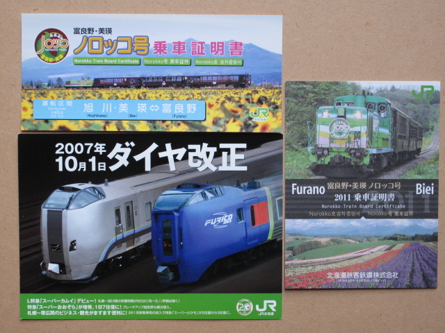 - 平成19~23年 JR 北海道 乗車証明書2点 記念絵葉書1点 計3点 富良野 ― 美瑛間 ノロッコ号 ダイヤ改正 スーパーカムイ号