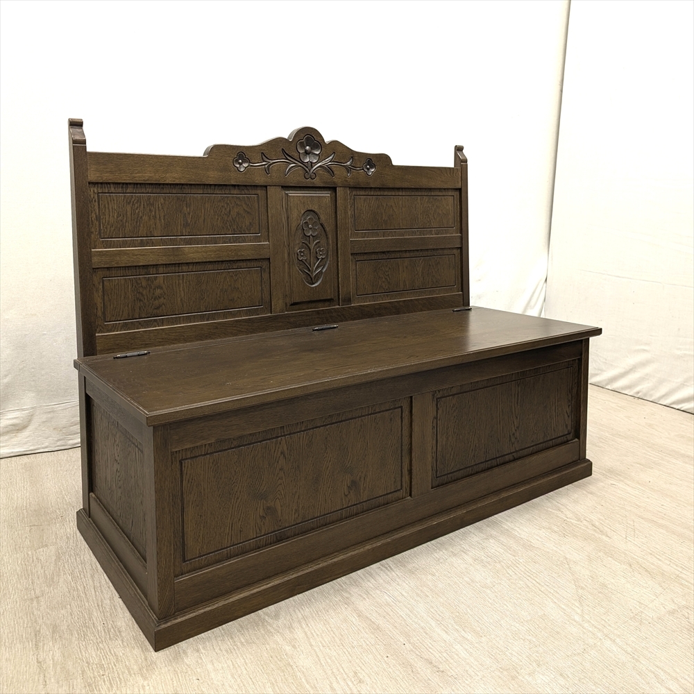 - ★美品★和光★楢 ナラ材★無垢★ ボックスベンチ モンクスベンチ オークセトル ベンチ 椅子 チェア 二人掛け 収納 彫り