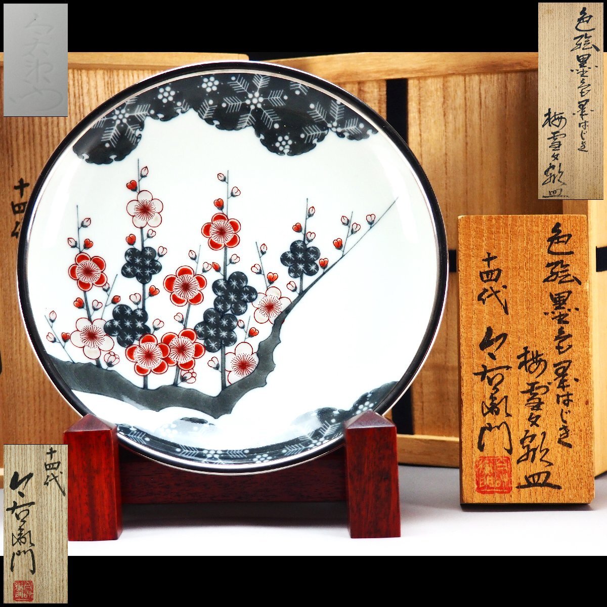 > 【治】十四代『今泉今右衛門』本人作 色絵 墨色 墨はじき 梅雪文 額皿☆共箱 題板付 幅 20cm 飾皿 (検索:酒井田柿右衛門) 本物保証 OH26