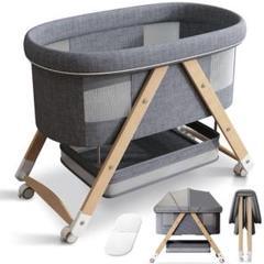 - ベビーベッド ゆりかご 3way 折りたたみ 木製 蚊帳 キャスター付き グレー