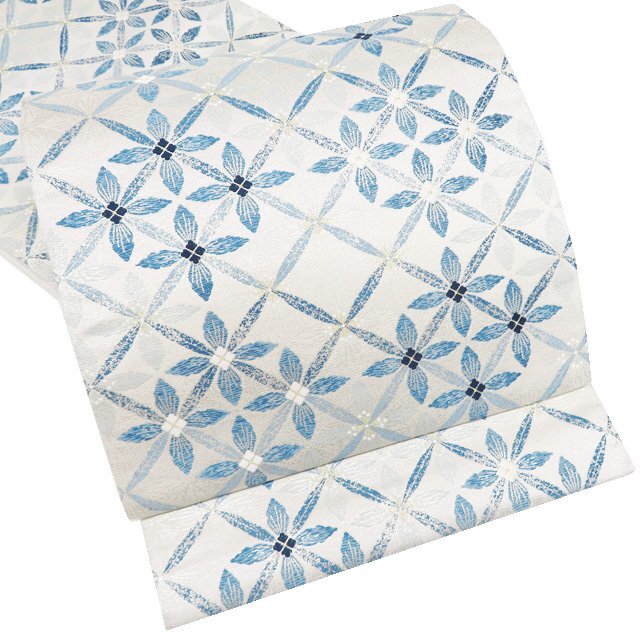 - 袋帯 中古 リサイクル 正絹 セミフォーマル 仕立て上がり 六通 花模様 箔糸 オフホワイト 縹色 金銀 きもの北條 A1283-10