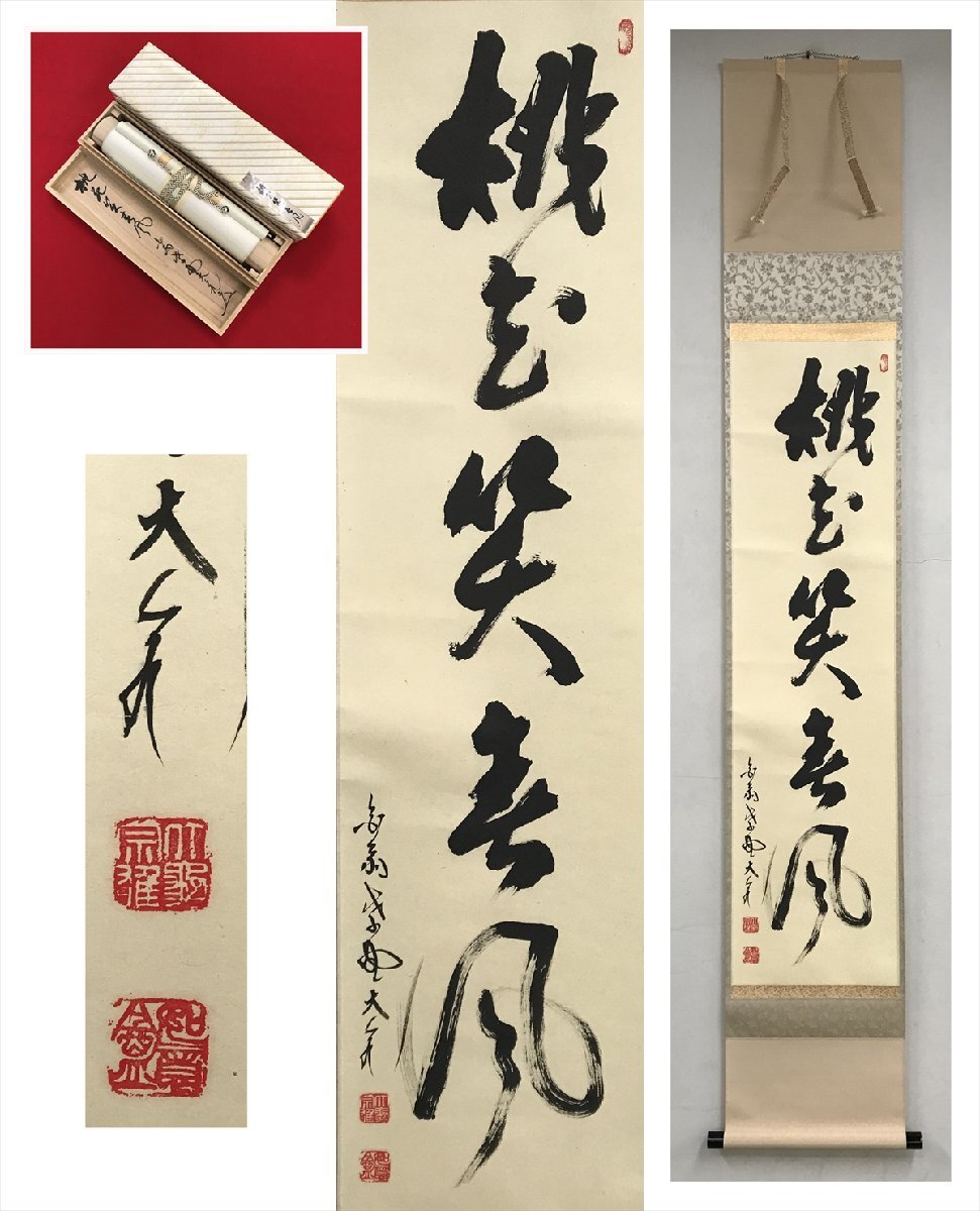 - 【千寿】大徳寺派 徳禅寺 立花大亀 桃花笑春風 一行書 紙本 d1695◆共箱 在銘 季節掛 茶掛 掛軸 掛物 茶道具