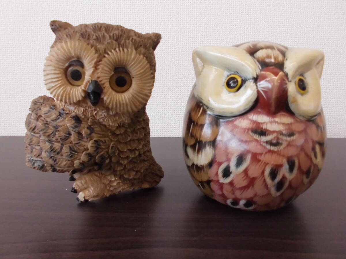 - [F75] フクロウ ふくろう 陶器 置き物 貯金箱 2点セット アンティーク 中古