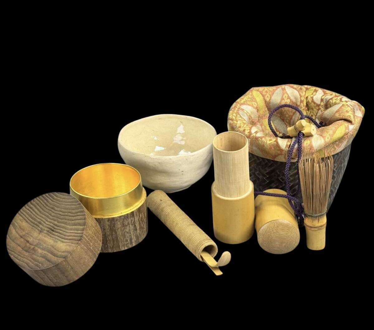 - 【偲】茶道道具一式 茶 金メッキ茶入 茶杓 巾着 茶筅 ケース 帛紗 茶道具 抹茶 r-496