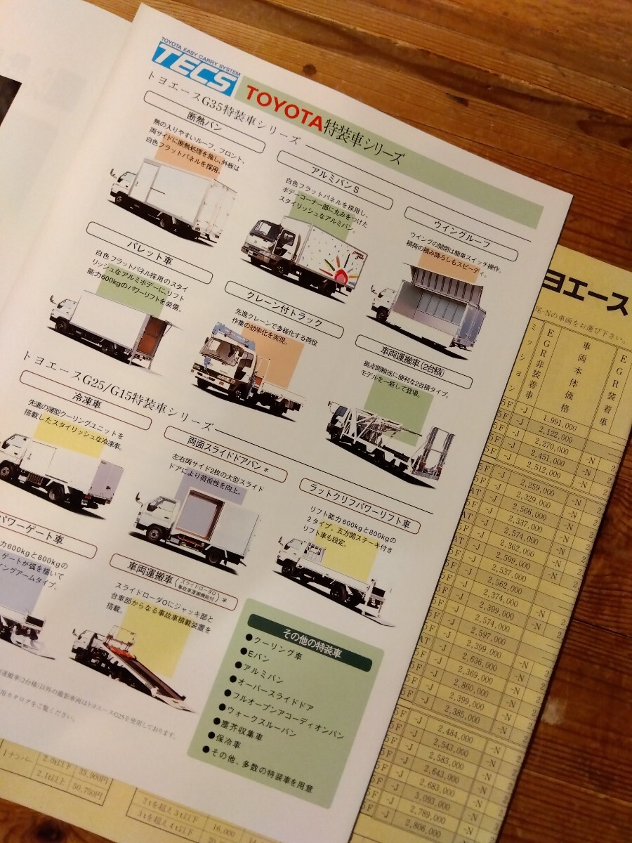 - 車6 平成レトロなトヨタトヨエースG35総合カタログ、平成7年(1995年)版、当時価格199万円〜、2.75トン/3トン/3.5トン、特装車#朝来佐嚢#