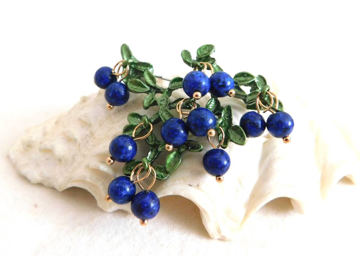- 【新品】ブルーベリーモチーフのブローチ ブルーベリー 揺れるブローチ 植物 ラピスラズリ色